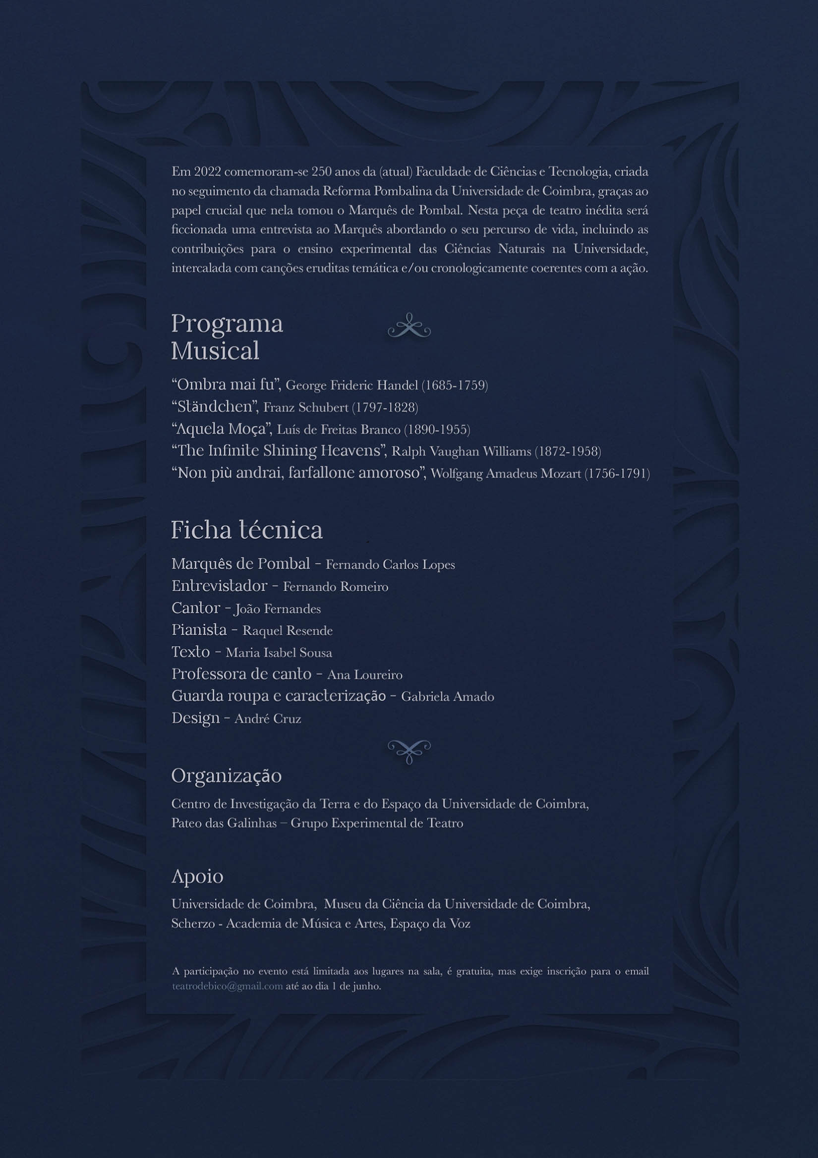 Em 2022 comemoram-se 250 anos da (atual) Faculdade de Ciências e Tecnologia, criada no seguimento da chamada Reforma Pombalina da Universidade de Coimbra, graças ao papel crucial que nela tomou o Marquês de Pombal. Nesta peça de teatro inédita, com texto de Isabel Sousa, será ficcionada uma entrevista ao Marquês abordando o seu percurso de vida, incluindo as contribuições para o ensino experimental das Ciências Naturais na Universidade, intercalada com canções eruditas temática e/ou cronologicamente coerentes com a ação.