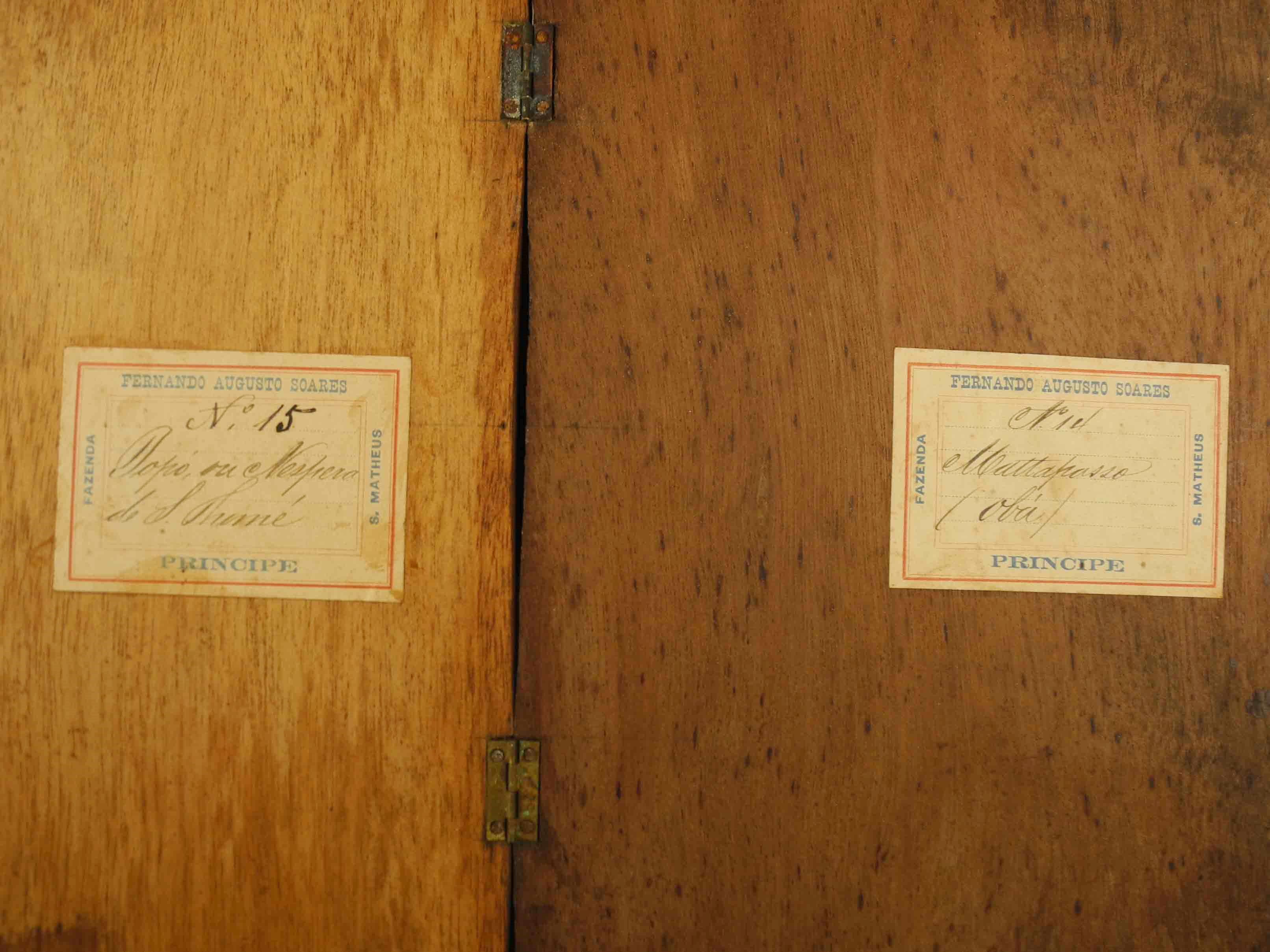 Em cada “folha-amostra” do livro, a madeira é identificada numa etiqueta com caligrafia antiga, onde constam, ao centro, um Nº e um ou dois nomes vulgares, que em baixo se discriminam; a toda a margem da etiqueta, igual nas 18 amostras, está indicada a proveniência - linha do topo: “Fernando Augusto Soares”; linha à direita: “S. Matheus”; linha na base: “Príncipe”; linha à esquerda: “Fazenda”.