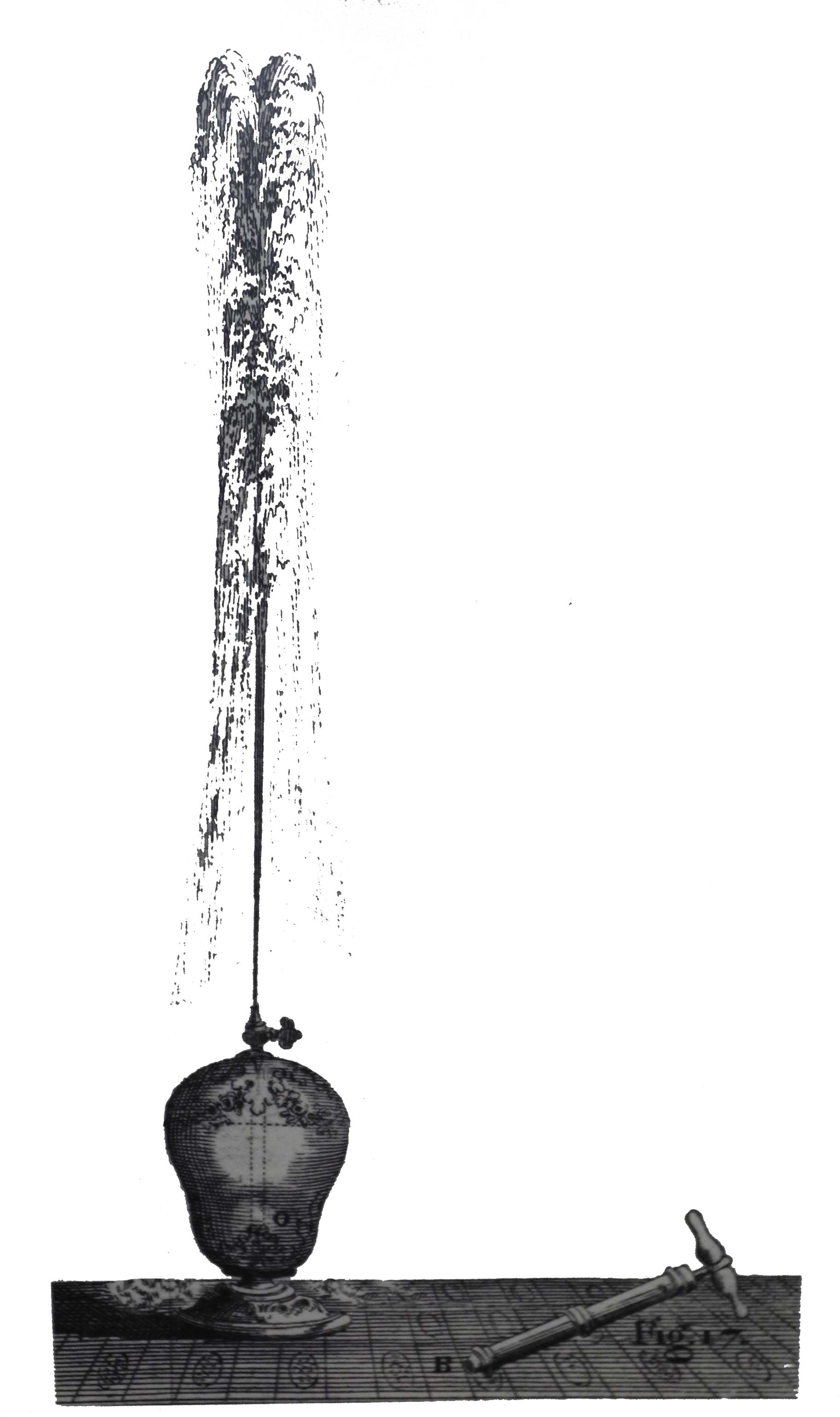 A fonte de compressão, aqui apresentada, é um desses instrumentos didáticos. Ilustra, de forma espetacular, um processo de elevação de água, provocada pelo ar contido, sob pressão, no interior da fonte.