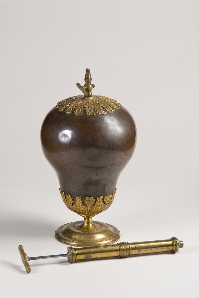 Este instrumento consiste num bonito reservatório metálico em bronze e latão dourado, em forma de pêra invertida, assente sobre um pé circular. No eixo interior do reservatório existe um tubo, munido de uma torneira exterior. Para pôr a fonte a funcionar retirava-se a torneira ligada ao tubo, ou seja, abria-se o recipiente e enchia-se com água, até cerca de dois terços da sua capacidade. Reposto o tubo e a torneira, retirava-se o terminal da torneira e ligava-se esta à bomba de compressão. Abria-se a torneira e introduzia-se no recipiente todo o ar que fosse possível. Finalmente, fechava-se a torneira, retirava-se a bomba, enroscando o terminal da torneira. Ao abrir a torneira, saía um jato de água, vulgo repuxo, que podia atingir facilmente 8 a 10 metros de altura.