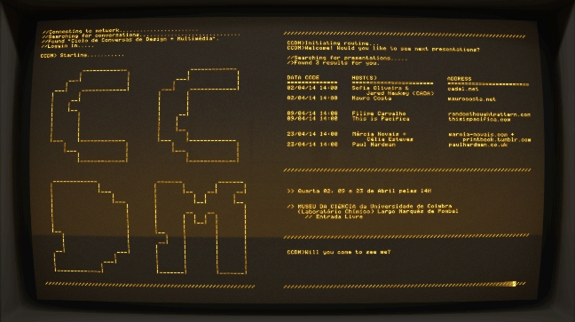 Evento realizado no âmbito dos cursos de Licenciatura e Mestrado em Design e Multimédia da FCTUC – Faculdade de Ciências e Tecnologia da Universidade de Coimbra, para o qual são convidados profissionais do mundo do Design a fim de partilharem com o público os seus trabalhos e a sua experiência profissional. A edição de 2014 será a sétima edição deste evento anual.
