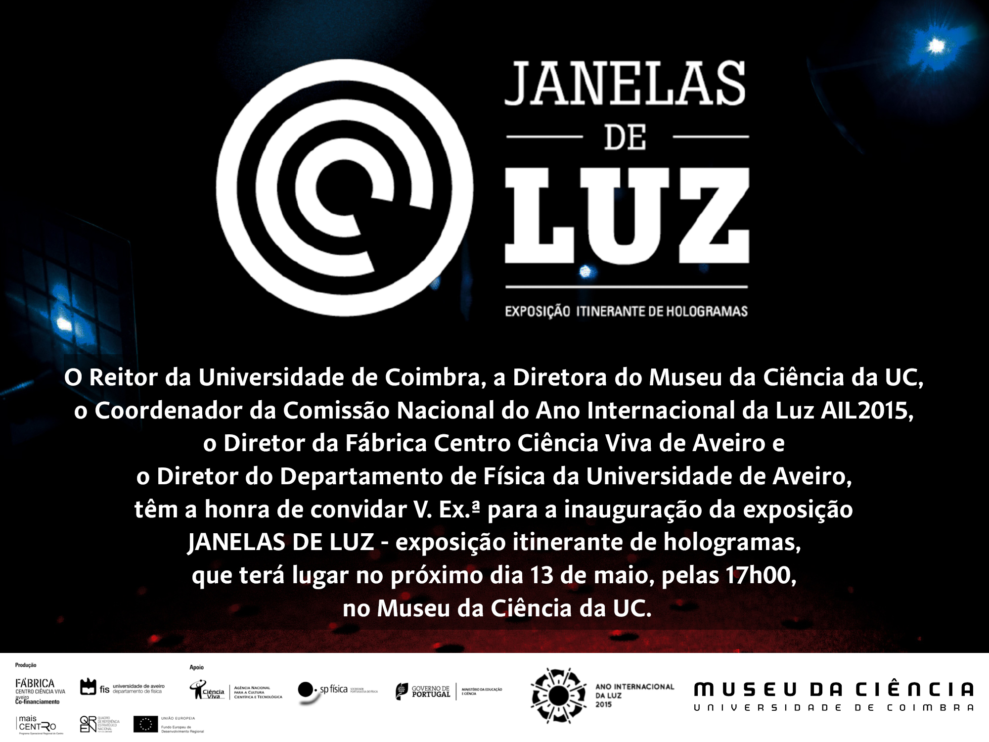 “Janelas de Luz” é uma exposição itinerante de hologramas que convida famílias, jovens e adultos a uma viagem ao mundo dos hologramas. De forma cativante e envolvente, o público é levado a explorar diversos aspetos da ciência que está por trás desta tecnologia. Ao longo da visita é possível responder às questões: para que servem? como se fazem? quais os materiais necessários? Para tal, a exposição inclui 5 componentes: 1 laboratório, 1 módulo com 6 painéis interativos, 1 mostra de 15 hologramas, 1 bancada de hologramas riscados e 1 quiosque informativo.