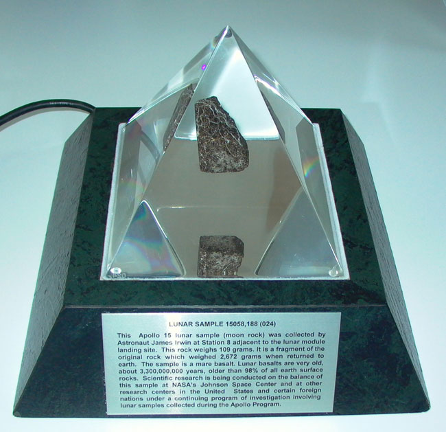 A pedra em exposição no Museu da Ciência foi recolhida por James Irwin durante a missão Apollo 15 (26 de Julho a 7 de Agosto de 1971), considerada pela NASA a missão tripulada mais bem sucedida de sempre.
