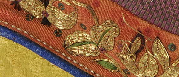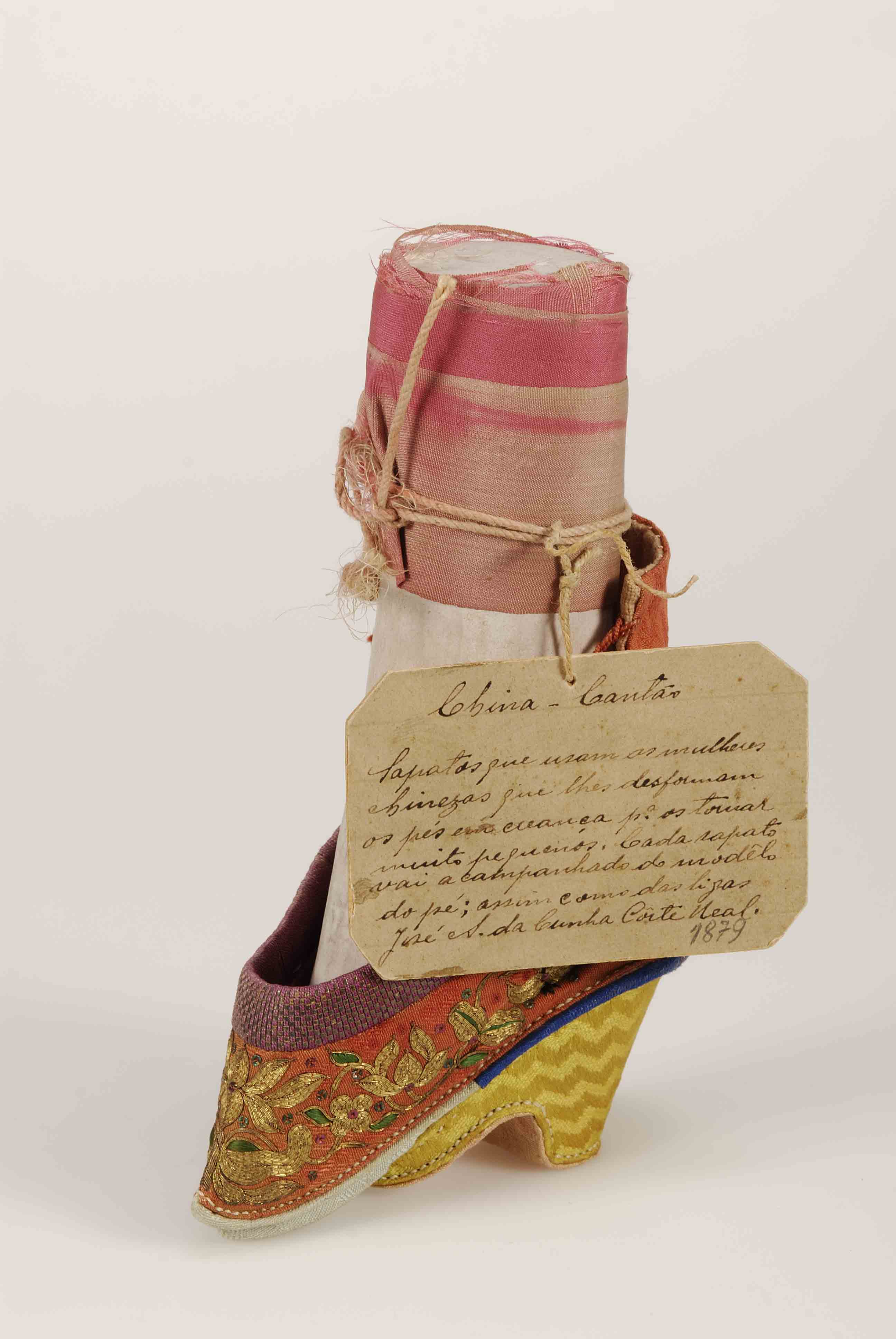 Deste conjunto faz parte este exemplar que hoje apresentamos, um sapato de lótus. Com a ajuda de uma faixa, procedia-se à compressão do pé que forçava os ossos dos tarsos, metatarsos e falanges dos pés para a região plantar, provocando deformações ósseas irreversíveis. Desde os primeiros anos de vida, as mulheres que pretendessem ascender socialmente eram submetidas a esta prática, que impedia o normal crescimento dos pés, sendo que, na fase adulta, não deveriam ultrapassar os 8 cm de comprimento.