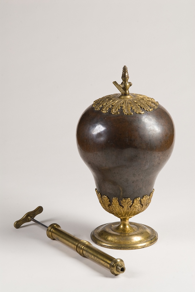 Este instrumento consiste num bonito reservatório metálico em bronze e latão dourado, em forma de pêra invertida, assente sobre um pé circular. No eixo interior do reservatório existe um tubo, munido de uma torneira exterior. Para pôr a fonte a funcionar retirava-se a torneira ligada ao tubo, ou seja, abria-se o recipiente e enchia-se com água, até cerca de dois terços da sua capacidade. Reposto o tubo e a torneira, retirava-se o terminal da torneira e ligava-se esta à bomba de compressão. Abria-se a torneira e introduzia-se no recipiente todo o ar que fosse possível. Finalmente, fechava-se a torneira, retirava-se a bomba, enroscando o terminal da torneira. Ao abrir a torneira, saía um jato de água, vulgo repuxo, que podia atingir facilmente 8 a 10 metros de altura.