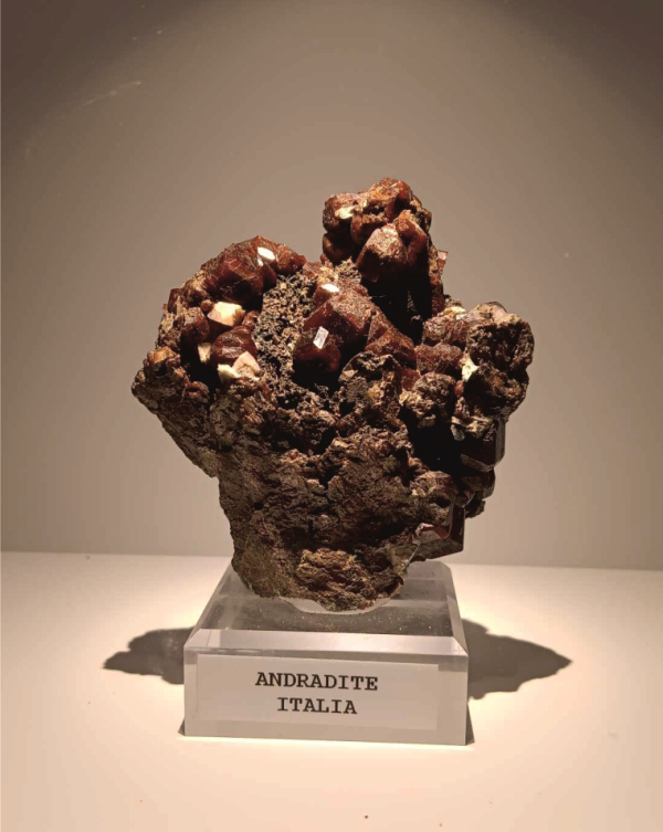 Dentre os mais de 20 mil exemplares da coleção de mineralogia e geologia destacamos um objeto que une ciência e história, o mineral Andradite. A Andradite é um mineral nesossilicato de cálcio e ferro do grupo das granadas com fórmula Ca3Fe2Si3O12. A andradite encontra-se em escarnitos de calcários impuros metamorfizados por contacto ou rochas ígneas cálcicas, em xistos cloríticos e serpentinitos e em rochas ígneas alcalinas. As suas cores variam entre vermelho, amarelo, castanho, verde ou preto a depender das substituições catiónicas que possam ocorrer. Pertence ao sistema cúbico, com dureza entre 6,5 à 7. É encontrada na Itália, nos Montes Urais, Arizona, Califórnia, Ucrânia, Brasil e Paquistão.